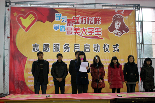 校团委积极响应衢州市号召,当天上午在学校体育馆举行“学习雷锋好榜样,争做最美大学生”青年志愿服务月启动仪式。来自各学院和学生社团13支志愿服务队共计300余名大学生志愿者参加了启动仪式。