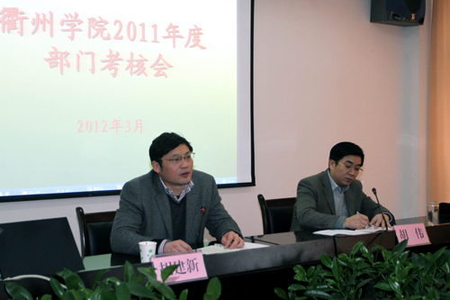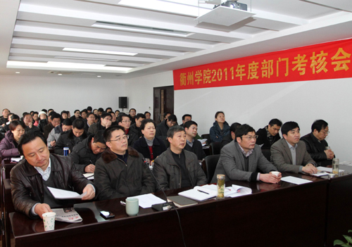 3月9日,我校举行2011年度部门考核会,校领导胡建新、胡伟、赵祖地、叶碧、潘海天、姚宏昌及全体中层干部参加会议。校党委书记胡建新作重要讲话,校长胡伟、党委副书记赵祖地分别主持会议。