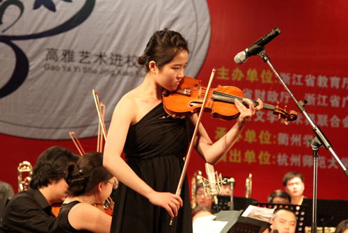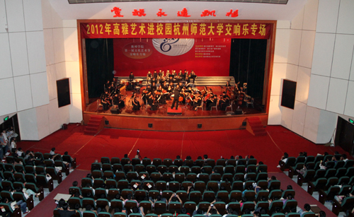5月9日晚,由中共浙江省委宣传部、省教育厅、省文化厅等单位共同主办的2012年高雅艺术进校园――衢州学院交响乐专场演出在校大会堂隆重举行。学校党委宣传部负责人在演出开始前致辞,热烈欢迎前来我校演出的杭州师范大学交响乐团全体演职人员。校长胡伟、党委副书记赵祖地和千余名师生代表一起观看了演出。