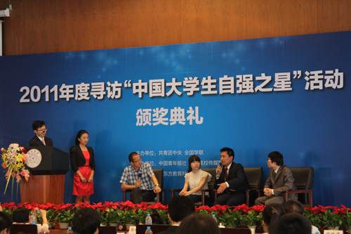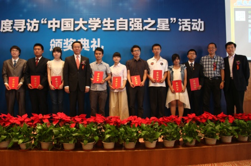 5月15日,由共青团中央、全国学联等单位举办的2011年度寻访“中国大学生自强之星”颁奖典礼在清华大学隆重举行。共青团中央书记处书记卢雍政、清华大学党委副书记史宗恺、中国青年报社社长徐文新、共青团中央学校部副部长杜汇良和新东方教育科技集团董事长兼首席执行官俞敏洪、创新工场董事长兼首席执行官李开复等出席颁奖典礼。 我校电气与信息工程学院学生杨杰与清华大学陈朝松、吉林大学秦志浩、南京航空航天大学李佳兴、福建农林大学刘海胜、黄河科技学院段志秀、武汉理工大学华夏学院刘普林、广西大学程海峰、海口经济学院莫金连、西北政法大学赵国栋共10位大学生荣获“中国大学生自强之星标兵”。因杨杰同学正在浙江淳安千岛湖国家水上运动训练基地紧张地备战奥运会,没有时间参加在清华大学举办的颁奖典礼,由我校团委副书记冯军民代为领奖。 卢雍政在颁奖典礼的讲话中指出:自强不息是中华民族的传统美德,是时代精神的重要体现,也是青年一代的人生支柱。团中央、全国学联举办寻访“中国大学生自强之星”活动的重要意义和目的,就是要引导更多青年学生弘扬坚韧不拔、自强不息、锐意进取的精神,在学习、工作、生活中依靠自身的奋斗和努力去实现自己的人生价值。卢雍政希望广大青年学生深刻领会、认真践行胡锦涛总书记在庆祝中国共产主义青年团成立90周年大会上对青年寄予的殷切期望,以“中国大学生自强之星”为榜样,在千磨万击中历练人生、收获成功。 在与现场百余学生交流中,俞敏洪老师谈到人要靠三种能力改变命运:坦然接受生命中发生的任何事情的能力;用善的精神改变世界的能力;相信通过自己的努力能够改变命运能力。 李开复在主题演讲中提出,奉献与个人发展应该平衡,他送大家两句话:最有钱的人不是拥有最多的人,而是他的欲望最小;一个人他一生价值的衡量,不是他拥有多少,而是他为这个世界留下多少。李开复希望随着年龄和阅历的增长,青年学生能够慢慢能够领会它的真谛。 寻访“中国大学生自强之星”活动由团中央和全国学联主办,中国青年报社和中国高校传媒联盟承办。作为活动协办单位,新东方教育科技集团从2007年起共分十年出资5000万元,设立“中国大学生五四奖励基金•新东方自强基金”,用于鼓励并资助寻访活动中涌现出的优秀大学生。该活动迄今为止已成功举办了6届。 寻访2011年度“中国大学生自强之星”活动自去年12月启动以来,受到高校团学组织和在校学生的广泛关注,共收到全国31个省区市超过1000所高校5000余名大学生的报名。活动最终产生了10名“中国大学生自强之星”标兵、100名“中国大学生自强之星”和800名“中国大学生自强之星”提名奖,他们将分别获得1万元、5000元、2000元“中国大学生新东方自强奖学金”。(文/楼琛)