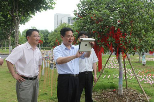 随后汪晓村还察看了数控技术校内实训基地以及材料力学、建筑结构等实验室。经过教学楼门口时,汪晓村饶有兴致地观看了我校大学生在这里举办的“五月鲜花”大型装置行为艺术展,他对将大学生文化艺术创作与校园生态环境保护美化相结合的教学形式表示充分肯定。