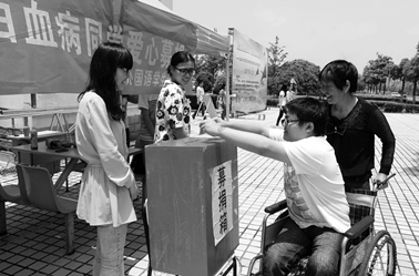 前段时间,衢州学院外国语学院二○一二级女生张佩持续高烧不退,五月十二日经医院检查发现,患急性髓系白血病,住衢州市人民医院治疗,生命危在旦夕。五月二十日,该院外国语学院学生会自发组织,向全校师生发起爱心募捐,现场共募集现金四万多元。五月二十一日,这笔钱被紧急送到了张佩手中。图为从小患有血友病、家境同样贫寒的大四学生张志源和妈妈一起来到捐款现场,把钱投进了捐款箱。 (本报通讯员 沈越懿 陈德力 摄)(责任编辑:浙江教育报)