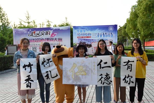 你瞧,竹香苑的同学们在食堂门口尽显书法的独特魅力。大笔一挥,提按顿挫间,便留下了“竹香怀礼,仁德有你”一词,还现场分发了写着“仁”字的书法作品,将仁德礼仪传递给衢院学子;紫藤苑的好男儿们一曲《精忠报国》,挥舞着国旗,尽显“君子喻于义”的男儿本色;桑竹苑的同学们身着古装,手持竹简,诵读着《论语》里的经典语录,通过人物对话形式,声情并茂的演绎古人间的“信”之道;风华苑的妹子们则在公寓楼前翩然起舞,演绎着她们的口号――公寓有礼,翩然风华。