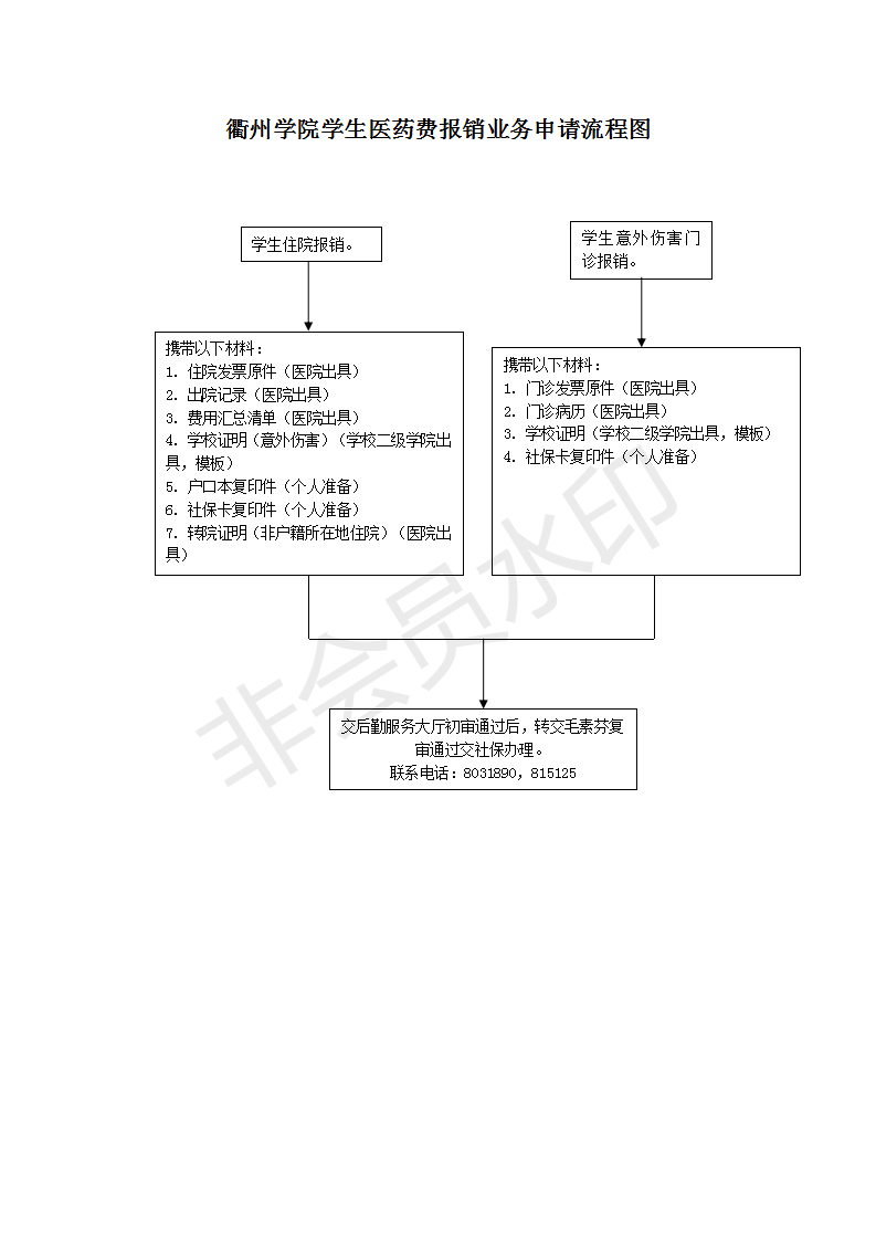| 受理条件 | 在校学生 | 需准备的材料清单 | 学生住院医保报销所需材料: 1. 住院发票原件(医院出具) 2. 出院记录(医院出具) 3. 费用汇总清单(医院出具) 4. 学校证明(意外伤害)(学校二级学院出具,模板) 5. 户口本复印件(个人准备) 6. 社保卡复印件(个人准备) 7. 转院证明(非户籍所在地住院)(医院出具) 意外伤害门诊报销材料: 1. 门诊发票原件(医院出具) 2. 门诊病历(医院出具) 3. 学校证明(学校二级学院出具,模板) 4. 社保卡复印件(个人准备) 衢州本地非意外伤害门诊、住院直接刷医保卡。 |