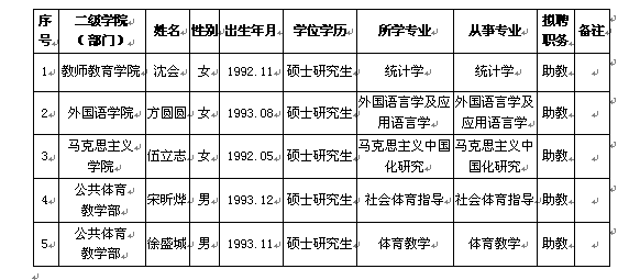 根据《衢州学院专业技术职务评聘办法(二次修订)》(衢院人〔2017〕35号)精神,经部门材料审核,人事处审定,现将拟初定沈会等5位同志专业技术职务信息公示如下: 公示时间:2018年9月11-9月17日,共7天。公示期内,可以来电、来信、来访向人事处反映公示对象存在的问题。联系电话: 8015033。 人事处 2018年9月11日