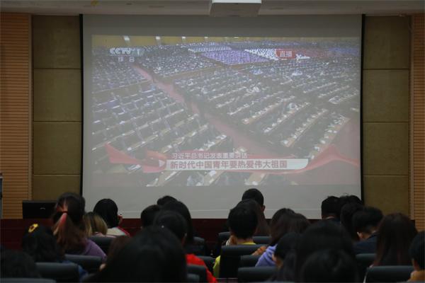 4月30日上午10时30分,纪念五四运动100周年大会在人民大会堂举行。中共中央总书记、国家主席、中央军委主席习近平出席大会并发表重要讲话。党委理论学习中心组成员在行政楼三楼一号会议室集中收看,校团委组织各学院分团委书记、学生干部代表、优秀团员代表在6号实验楼同步收看;各二级党组织分别组织党员干部和团员青年收听收看大会直播;在学生公寓、办公室等场所的师生也纷纷通过电视、网络、广播等形式收看收听习近平总书记重要讲话。