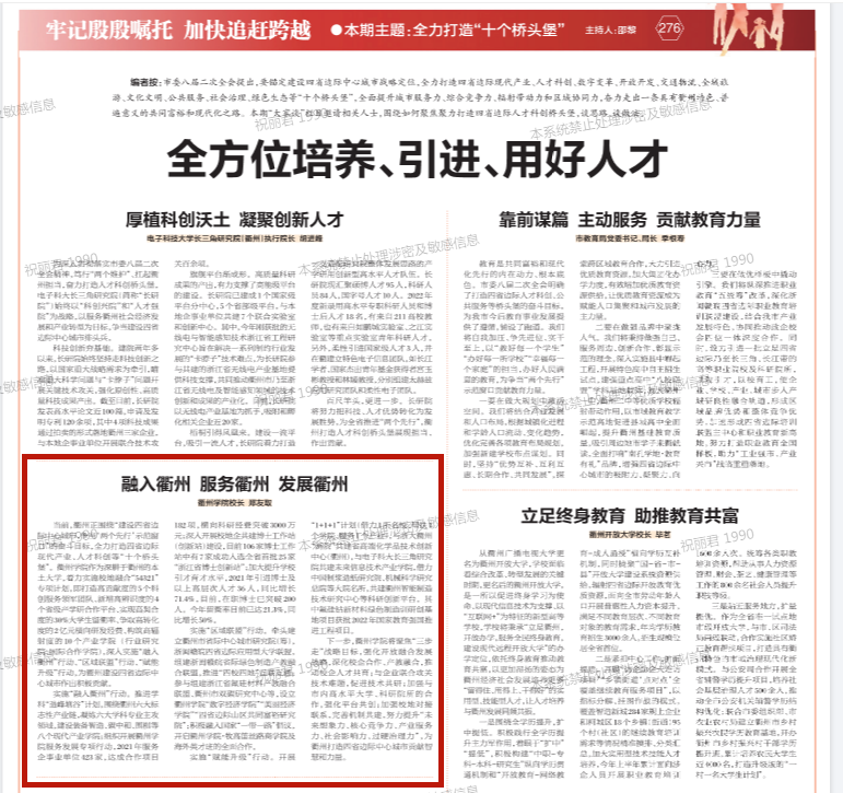 实施“赋能升级”行动。开展“1+1+1”计划(借力1所名校、帮扶1个学院、服务1个产业),与浙大衢州“两院”共建省高端化学品技术创新中心(衢州),与电子科大长三角研究院共建未来信息技术产业学院,借力中国制浆造纸研究院、机械科学研究总院等大院名所,共建衢州智能制造技术研究中心等科研创新平台。其中氟硅钴新材料绿色制造训研创基地项目获批2022年国家教育强国推进工程项目。