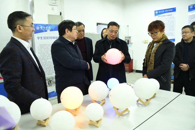 王利琳一行参观先后走访了机械工程学院、建筑工程学院、创业学院、电气与信息工程学院和化学与材料工程学院等实验实训场所,详细了解学校科学研究、师资引育、人才培养等方面的做法。在产教融合中心,王利琳一行详细了解我校主动服务地方开展校企合作设立博士工作站情况;在创业学院的非遗实训室,仔细观看学生的手工艺创作后,为我校将本土非遗文化融入劳动教育的做法点赞;在建工学院、信息学院和化材学院,他们观摩了各类师生共创的科研项目,详细了解学校科研人员构成及产学研工作开展情况,对学校充分发挥地方性应用型大学的优势,将高校优质资源持续导入当地产业发展,不断提升平台能级,实现校地融合发展的做法表示赞赏。
