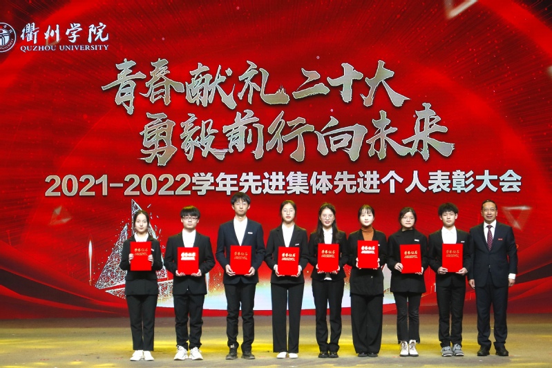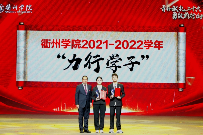 “力行学子”获得者代表王书文回顾了在衢院从青涩到成熟,从迷茫到坚定,从无知到智慧的一路蜕变,从“坚定方向、探索未知、全面发展”三方面分享了经验;省政府奖学金代表(2021年度“中国大学生自强之星”)李兵兵、创新创业学生代表杨开元、优秀学生干部代表吴淇望三位同学也分享了自己的青春故事与感悟心得。作为学生大学时光里亦师亦友的成长导师,优秀辅导员代表徐慧敏分享了她13年辅导员生涯的育人感悟。特优学风班代表20建筑(1)班围绕学风建设、科研竞赛、志愿服务、班团活动等内容展示了班级优良学风和班级成员蓬勃向上的青春活力;文明寝室代表6-503寝室展现了“和而不同”“五育并举”的“六边形”完美组合,传递着“寝你放心,未来有我”的温暖力量。