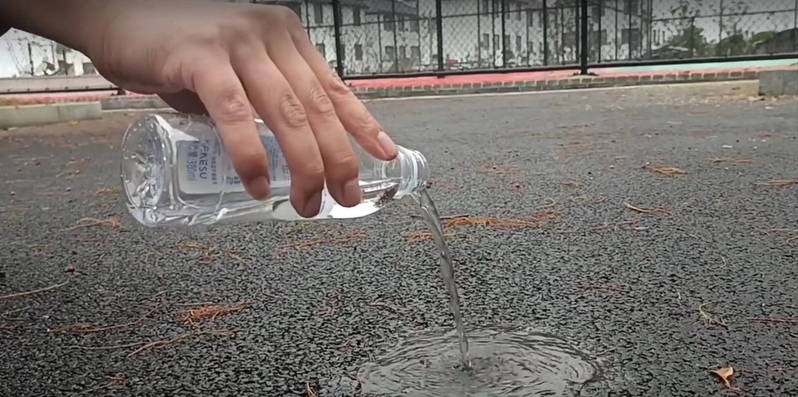2月14日,衢州市柯城区万田乡坞石村,一个有趣的小实验正在进行:把满满一瓶水倒在一段特殊的水泥路上,水没有往低处流,反而如同被海绵吸收一般,迅速被水泥路吸收。一瓶水倒完的同时,路面就恢复了干燥。