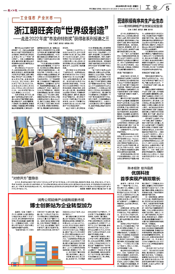 衢州学院“民盟同心博士工作站”负责人蔡建臣教授介绍,立足企业实际需求,发挥博士作用,工作站近年来已为“三美五金”“钱隆新材料”“华宁电气”“钧通塑胶”“永安消防”等企业解决了一批技改、扩容、提质、转型等难题,将科技成果写在了生产车间里,服务范围从市本级辐射至江山、常山等地,受到了企业的好评。