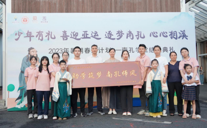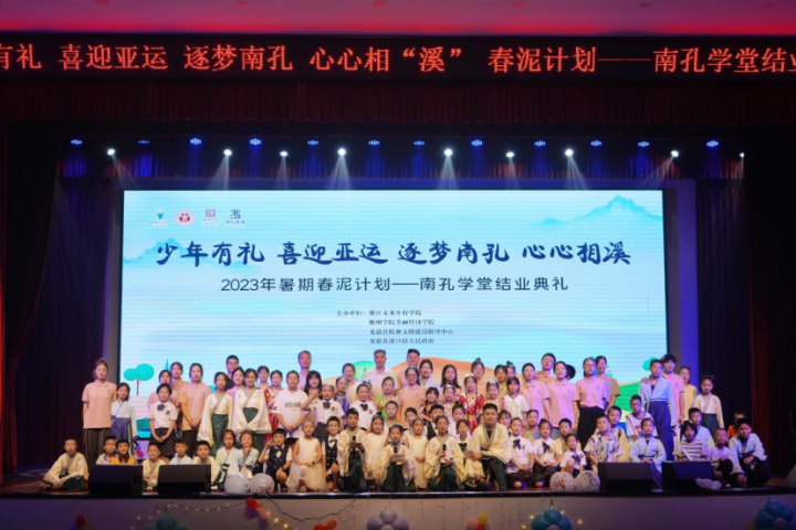 7月30日晚,在龙游溪口未来乡村大礼堂,一场盛大的结业典礼——南孔学堂“少年有礼,喜迎亚运,逐梦南孔,心心相‘溪’”结业汇报演出暨结业典礼举行,溪口的孩子们在衢州学院学生志愿者的陪伴下度过了一个充实而有趣的暑期后,将学堂所学自行编排成一个个精彩纷呈的节目。