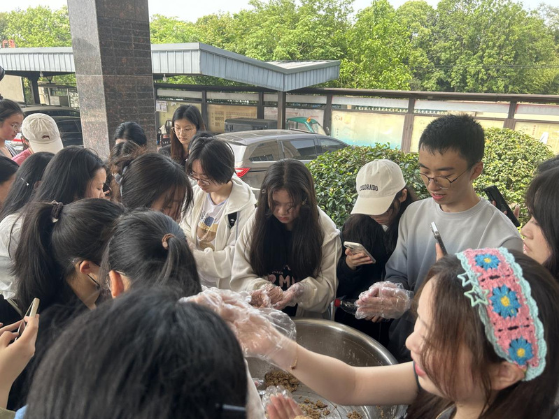 进村后,师生们首先来到村委会,与非遗传承人、村委副书记包秋根亲切交流,了解村庄的发展历史、现状及未来的乡村发展规划。随后,张妈妈小吃非遗传承人张胜英向大家展示如何制作当地特色美食龙游肉圆,并讲述了美食背后的历史文化故事。在张胜英的悉心指导下,师生们动手实践,从选料、切肉、搅拌到成型,每探索一步就总结一步。2022级中文2班学生汪晗说,制作的技艺虽不复杂,但饱含着古人的智慧结晶,学习这样的非遗技艺,有助于进一步理解古人的思想和理念,对语文、历史等学科的学习也有帮助。