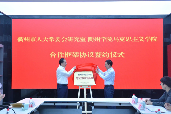 5月11日上午,衢州学院马克思主义学院与衢州市人大常委会研究室合作框架协议签约仪式在衢州市人大代表联络总站举行。仪式上,双方正式签订了合作框架协议,并为衢州学院大学生思政实践基地揭牌,标志着衢州学院与衢州市人大首个市域大思政“理论联盟”形成。