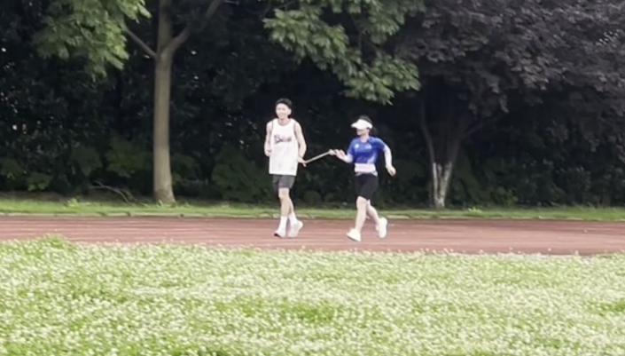 6月16日清晨6点半,在衢州市职业技术学院操场,衢州“与光同行·益起跑”助盲跑团的视障人士进行周末户外例跑,来自衢州学院和衢州职业技术学院的大学生志愿者们放弃周末休息时间,用一根牵引绳陪视障人士完成当天的跑步计划。