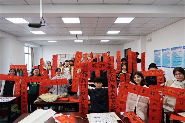 国际交流生们纷纷表示,通过这次书法课,他们不仅学会了如何书写春联,更是深刻感受到了中华传统文化的博大精深与无穷魅力。来自阿塞拜疆的尚美诗激动地说:“这学期,我有幸接触并学习了书法,它竟是充满趣味、充满挑战的一项艺术活动。我沉醉于那每一笔都需要精准拿捏、全神贯注的书写过程,它让平凡的书写变成了一种高雅的艺术享受。最让人振奋的是,当我亲眼见证线条与形状如何和谐共融、完美搭配,勾勒出一幅幅既蕴含丰富情感又彰显独特个性的艺术作品时,内心充满了无比的喜悦与自豪。这是我第一次亲手书写春联,感觉非常新奇、非常有趣。通过这个过程,我更加深入地了解了中国的传统文化和习俗,也更加热爱中国了。”
