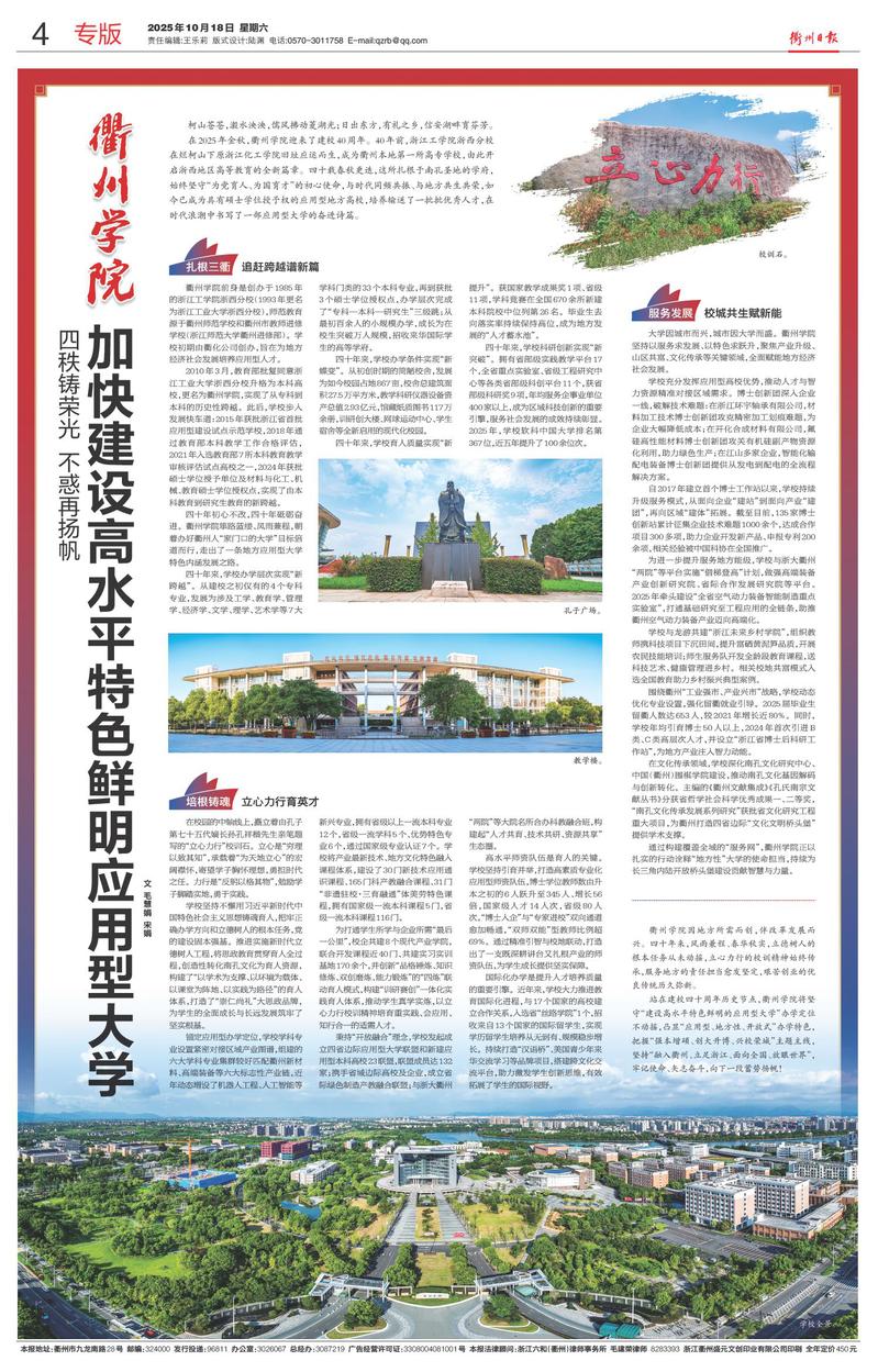 10月18日,《衢州日报》以《四秩铸荣光 不惑再扬帆 衢州学院加快建设高水平特色鲜明的应用型大学》为题,专版报道我校40年办学成绩。