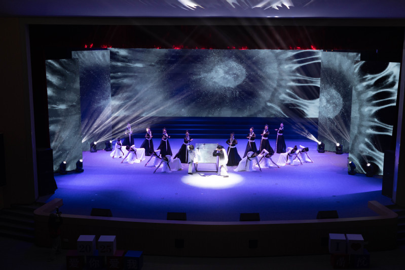 晚会在气势磅礴的二十四节令鼓鼓点声中拉开帷幕。原创歌曲《奔跑吧英雄》,唱出了衢院人勇往直前、无畏挑战的豪迈气概。情景剧《前路》以质朴而真挚的表演,再现了学校创办初期,老一辈建设者不畏艰难、团结协作、艰苦创业的奋斗场景。舞蹈《弈》从“烂柯围棋”中汲取灵感,传递出衢院人锚定目标、谋篇布局的智慧。“这就是我们衢院,在时代的洪流中乘风破浪,用只争朝夕的坚定信念,努力创造属于自己的灿烂和辉煌……”师生代表倾情朗诵,深情回望学校筚路蓝缕的办学历程,热情讴歌学校发展的丰硕成果,抒发直挂云帆济沧海的豪情。