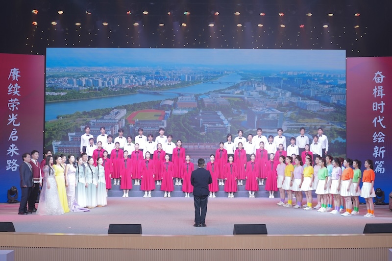晚会尾声,校旗在庄重灯光下徐徐铺展,全体师生唱响校歌,悠扬激昂的旋律振奋人心,鼓舞前行,共祝衢院四秩荣光,共启未来崭新篇章。