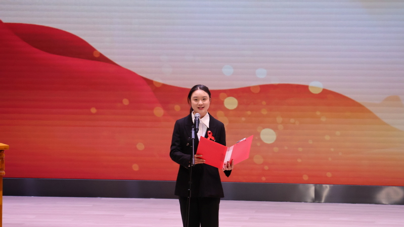 衢州学院“00后”理论宣讲团成员王承越代表青年学子宣读《知艾防艾 共享健康》倡议书,呼吁广大同学增强防艾意识,消除歧视观念,凝聚起终结艾滋流行的青春力量。