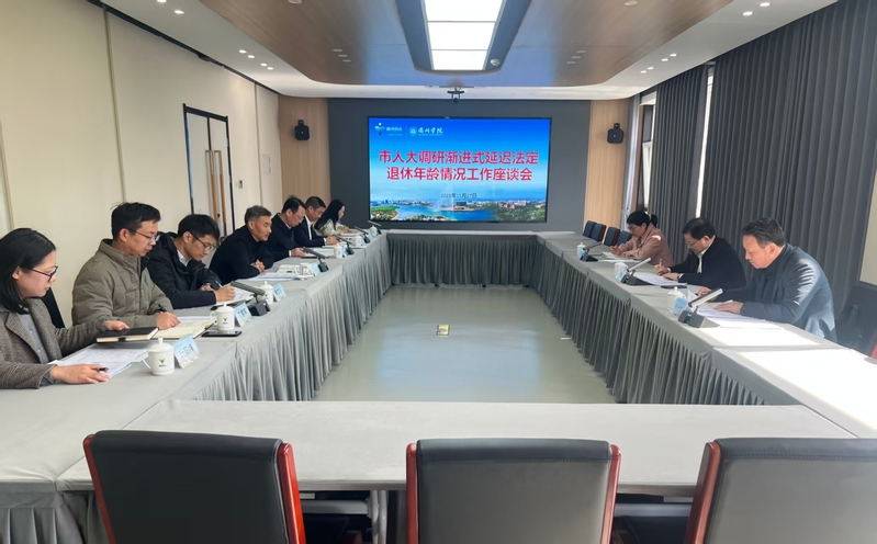 11月27日上午,衢州市人大常委会党组副书记、副主任刘根宏一行来我校,就渐进式延迟法定退休年龄改革工作开展专项调研指导。副校长郑文山,市人大、市人社局及我校人事处相关负责人参加座谈。