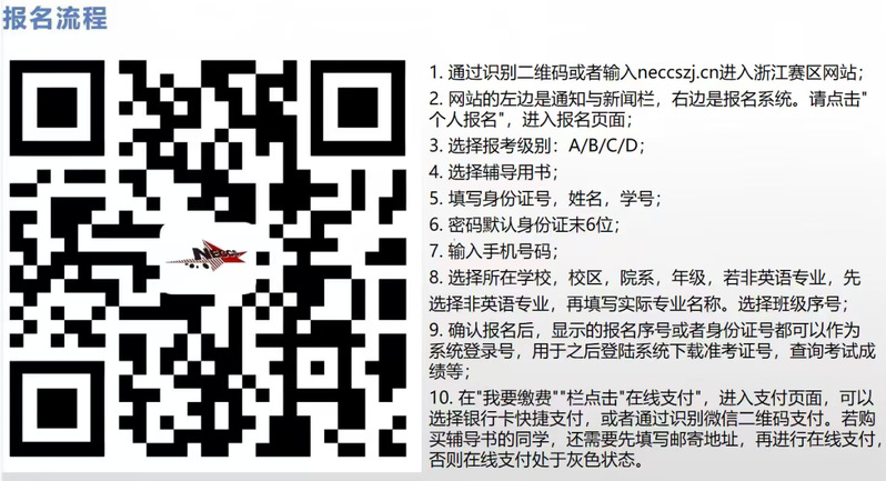 本竞赛分A、B、C、D四个类别。A类考试适用于研究生;B类考试适用于英语专业本、专科学生;C类考试适用于非英语专业本科学生;D类考试适用于体育类和艺术类本科生和非英语专业高职高专学生参加(请学生按照自身条件选择报考)。全国大学生英语竞赛(NECCS)浙江赛区报名网站www.neccszj.cn,竞赛相关通知会在平台同步发布,有关疑问也可与微信客服15658020937或QQ客服3577736593交流询问。报名费为50元/人,学生可登陆网站报名或直接扫码报名,报名二维码及流程见下图: