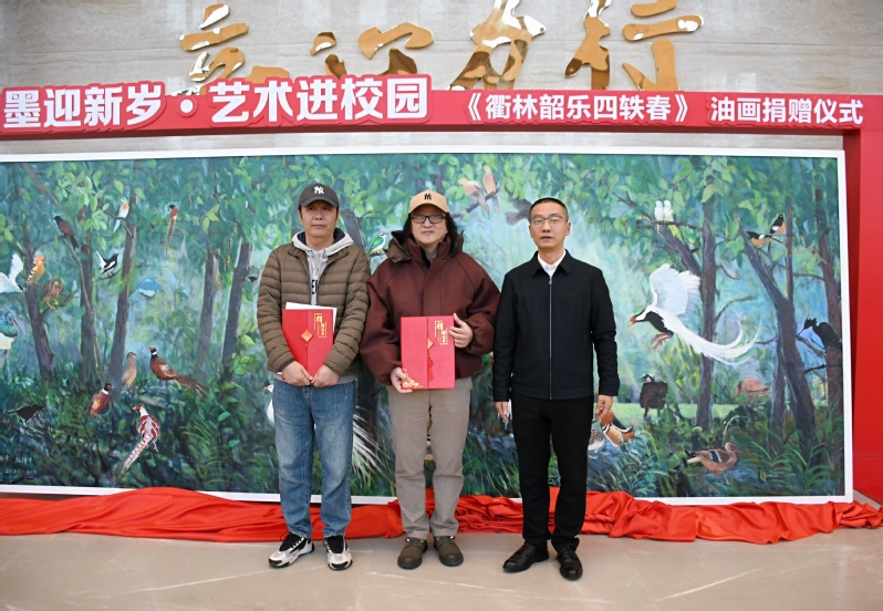 活动现场举行了《衢林韶乐四轶春》油画捐赠仪式。该作品宽5米、高1.9米,由罗剑华与阮渭平联袂创作,以形色光影描绘了衢州山川育秀、文脉绵长的生机图景。画中层林叠翠,绿意涌动,四十只飞鸟姿态各异、灵动自然,既呼应衢州“国家森林城市”的生态底色,也寓意着在衢州建市和衢州学院建校四十载的光阴中,城市与学校的同频共振、蓬勃发展。