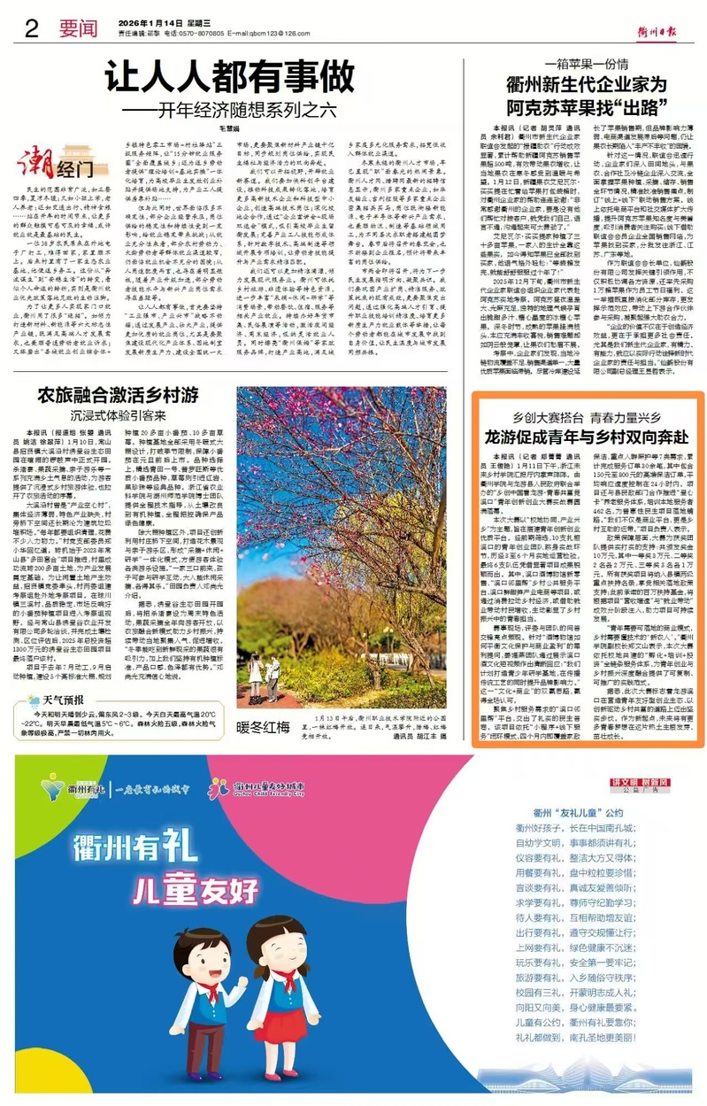 2026年1月14日【衢州日报】:乡创大赛搭台 青春力量兴乡 龙游促成青年与乡村双向奔赴